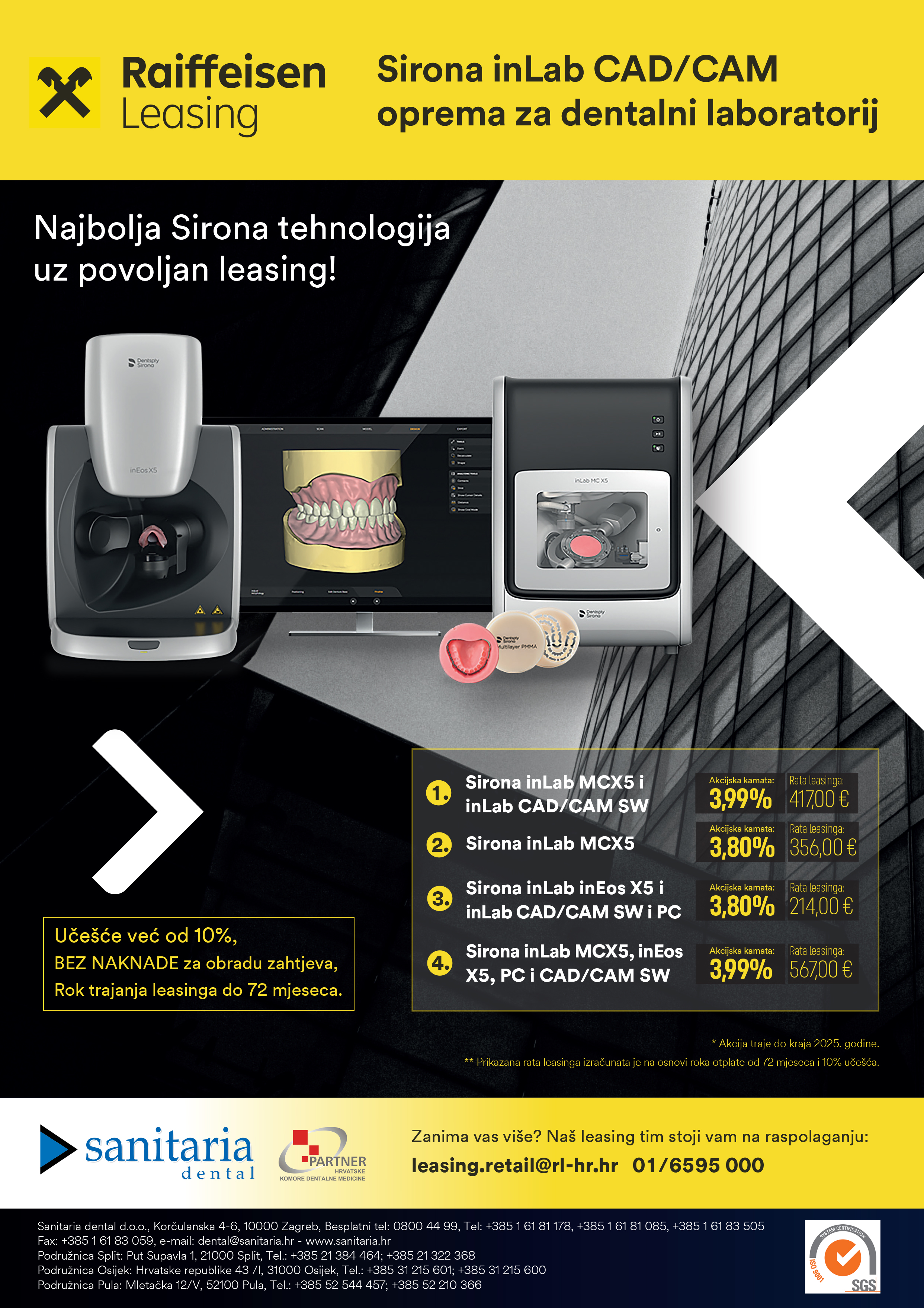 Akcijski uvjeti vrijede za stomatološku opremu koju partner Sanitaria Dental d.o.o. uključi u akciju te ih nije moguće kombinirati s ostalim akcijama partnera i/ili Raiffeisen Leasinga.